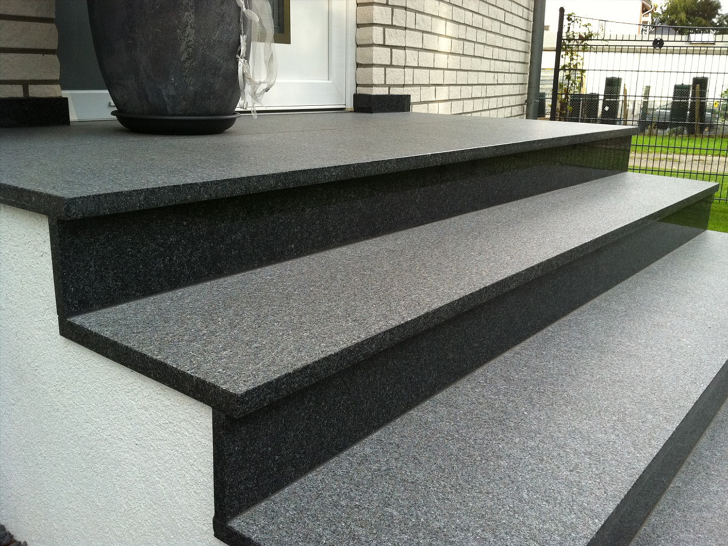 Natursteineingangspodeste kommen dort zur Geltung, wo das Niveau von der Straße zum Hauseingang nur eine Tritthöhe betrifft. Mit einem Naturstein-Eingangspodest schafft man die einfachste und günstigste Lösung zur Gestaltung des Hauseingangs. Zu empfehlen ist hier ein rutschfester und frostsicher Granitstein.
