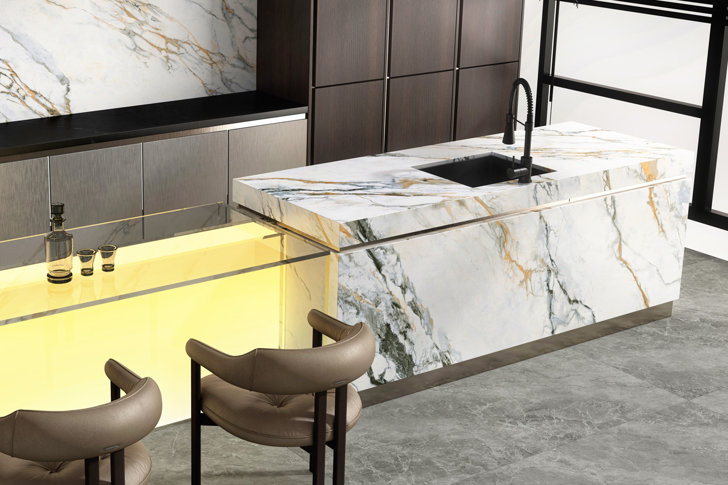 | Auf strahlend kristallweißem Fond entfaltet sich ein dramatisches Spiel aus kontrastreichen Adern: Tiefes Anthrazit verschmilzt mit edlen Ocker- und Goldtönen zu einer lebendigen Marmoroptik. Die dynamische, diagonale Linienführung verleiht jedem Raum Weite und Bewegung, während die warmen Goldeinschlüsse ein Gefühl von Luxus und Behaglichkeit erzeugen. So entsteht eine Oberfläche, die besonders für Räume geeignet ist, die beeindrucken sollen. | |||||||