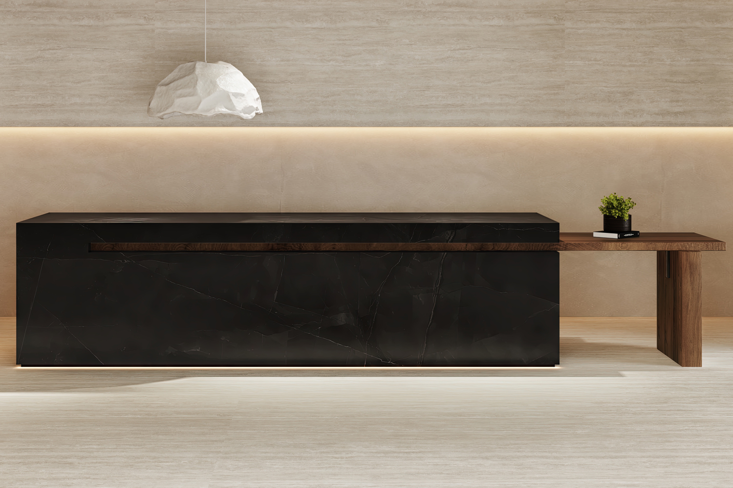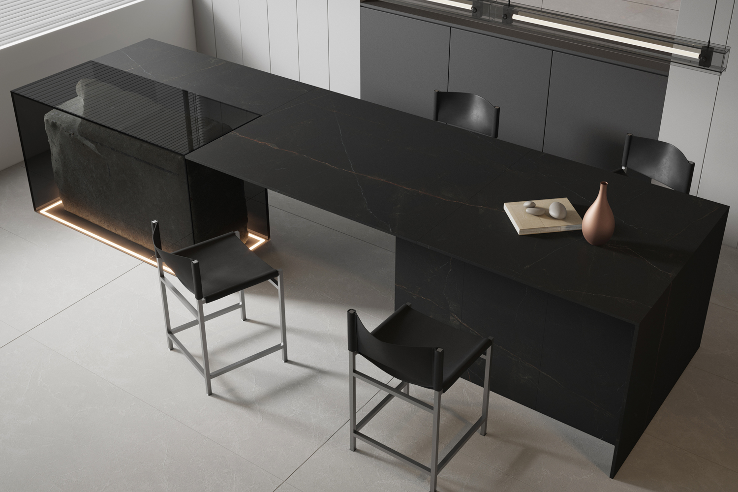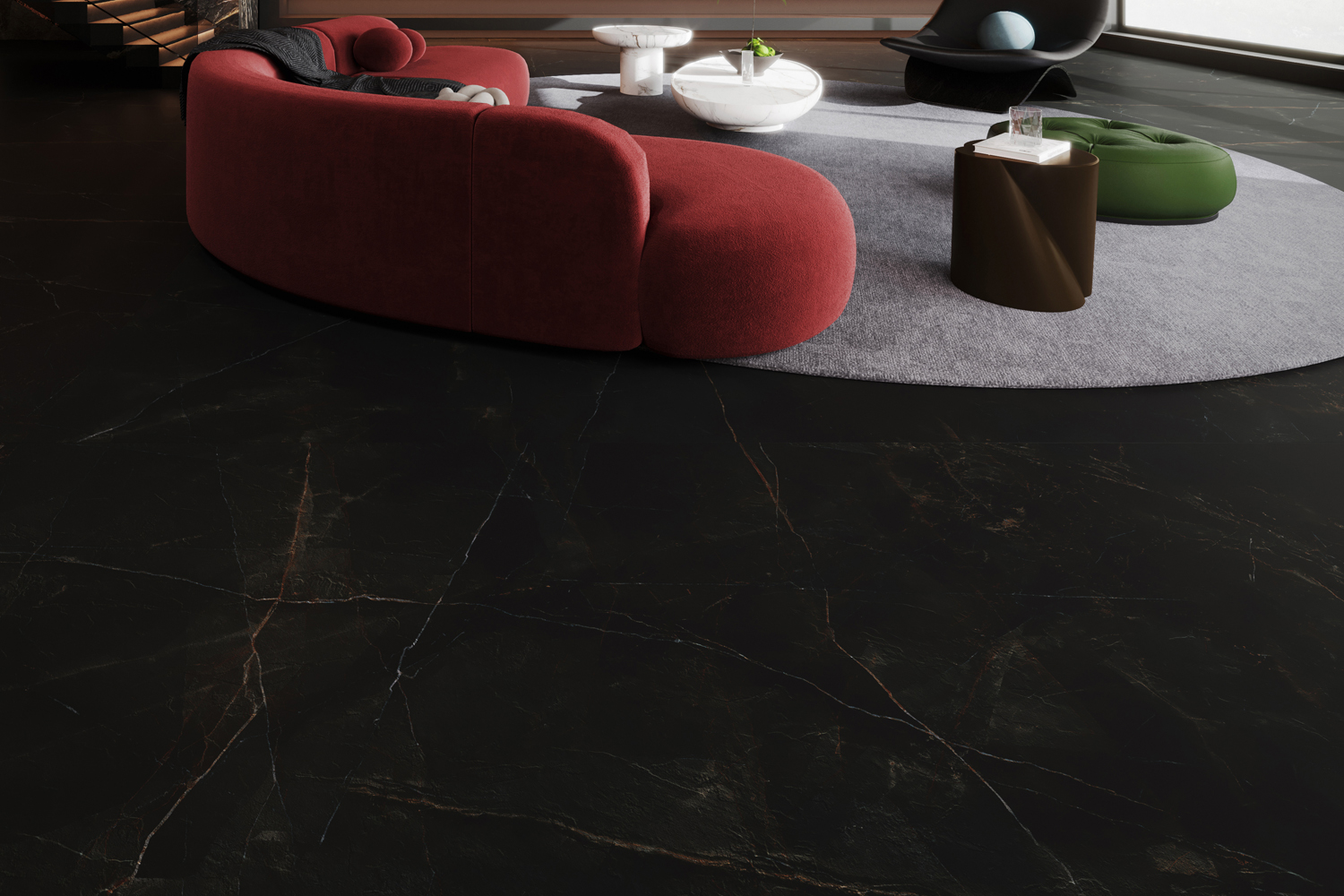 | Diese tiefschwarze Keramikoberfläche steht für pure, dramatische Eleganz. Das nahezu lichtlose Schwarz wirkt wie eine ruhige, edle Bühne und lässt Formen, Linien und Materialien im Raum noch stärker hervortreten. Zarte Aderungen in weichen Grauschattierungen legen sich wie ein feines Netz über den Hintergrund und erinnern an polierten Naturstein. So entsteht eine lebendige, organische Wirkung, ohne dass die Fläche laut oder unruhig erscheint. Ideal für Innenräume, die klare Gestaltung, Stilbewusstsein und einen Hauch großstädtischen Luxus ausstrahlen sollen. | |||||||