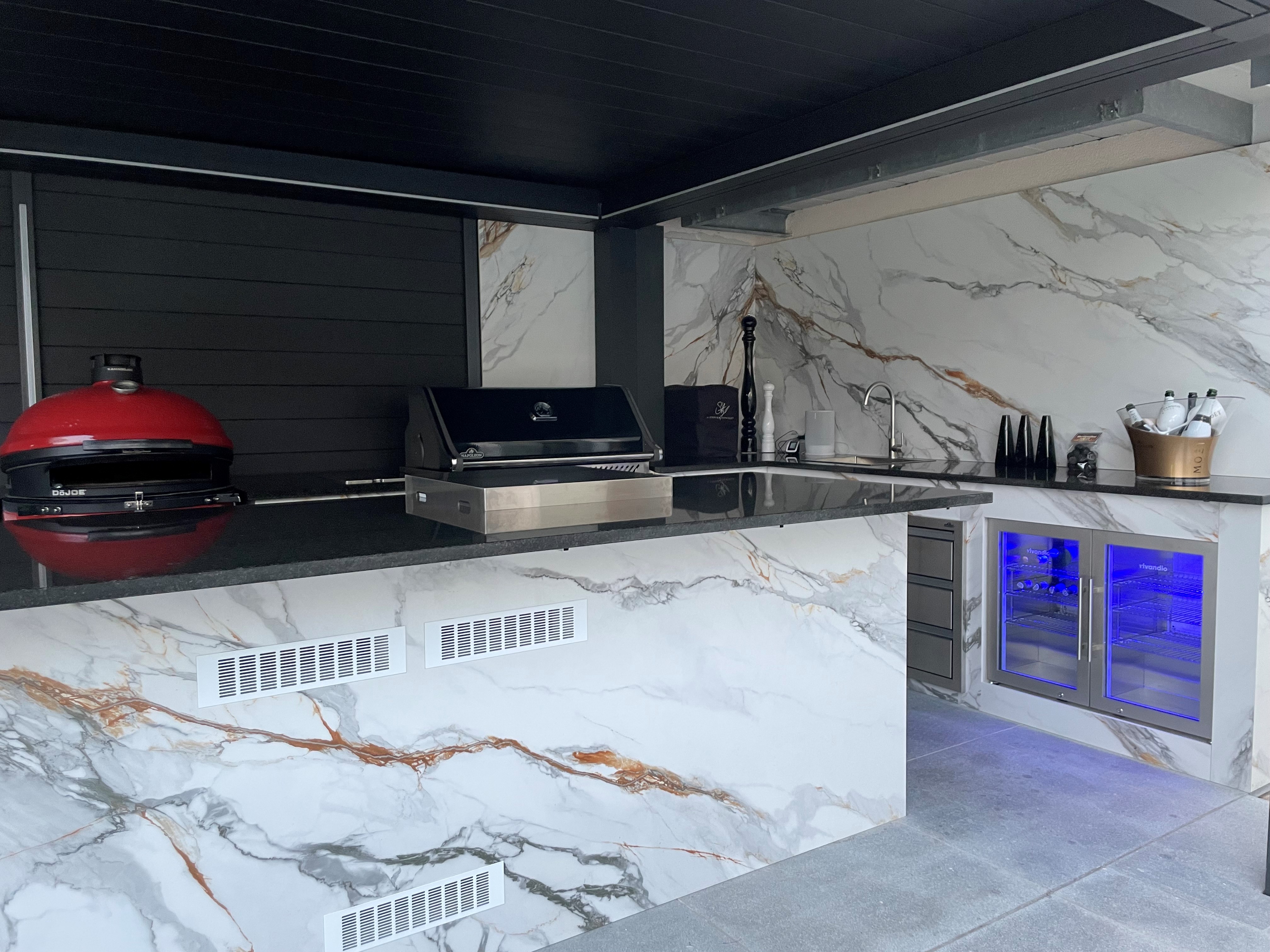 Eine Outdoorküche vollendet mit robusten Natursteinarbeitsplatten sind das Aushängeschild eines jedem Garten, Terrasse oder Wintergarten. Der Korpus Ihrer Outdoorküche lässt sich schnell und leicht aus unserem Produkt WakuStone errichten. Eine Arbeitsplatte aus Naturstein mit passenden Seitenverkleidungen ist empfehlenswert, weil WakuStone und Keramik frostsicher, hitzebeständig, UV-beständig und gut miteinander kompatibel ist.