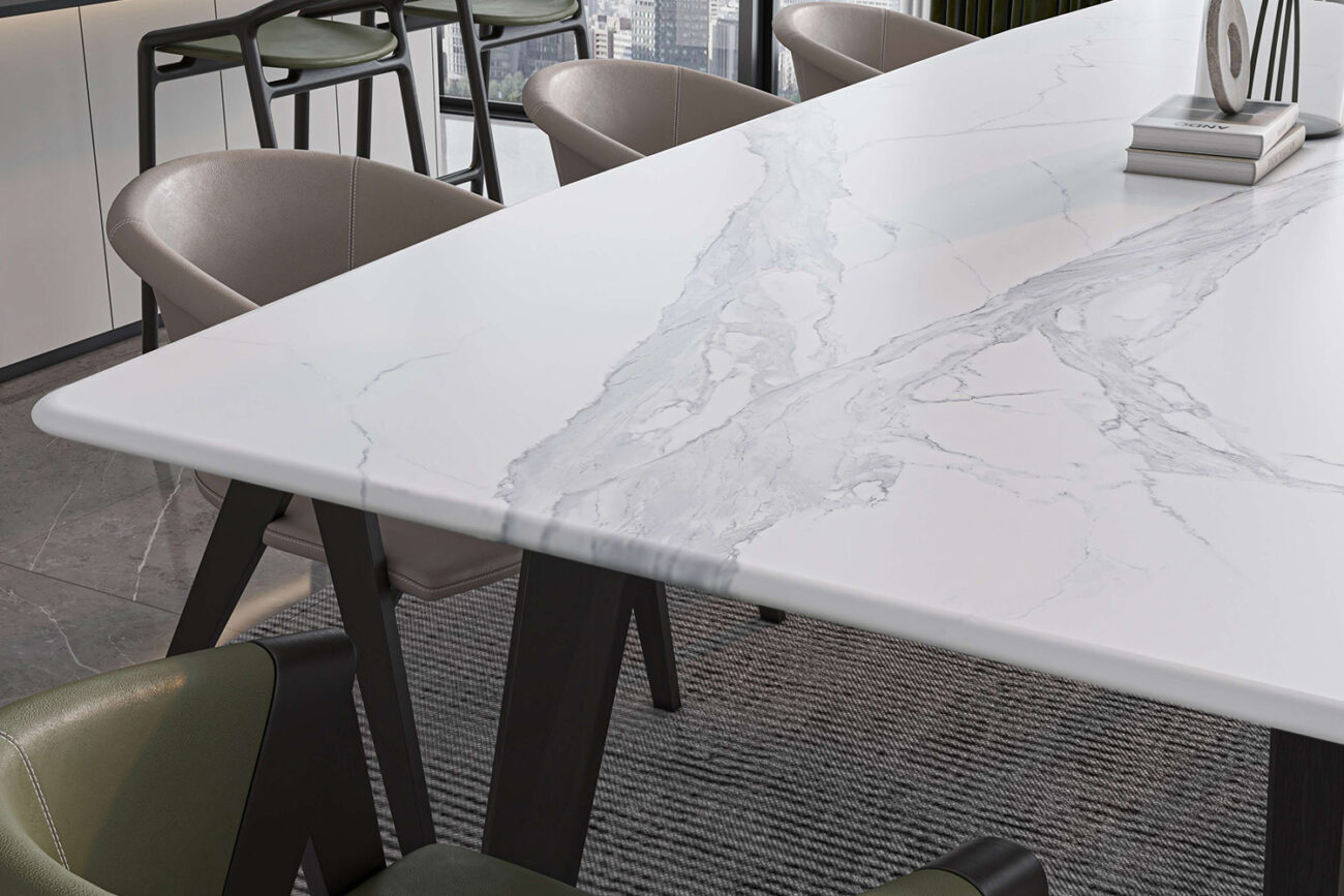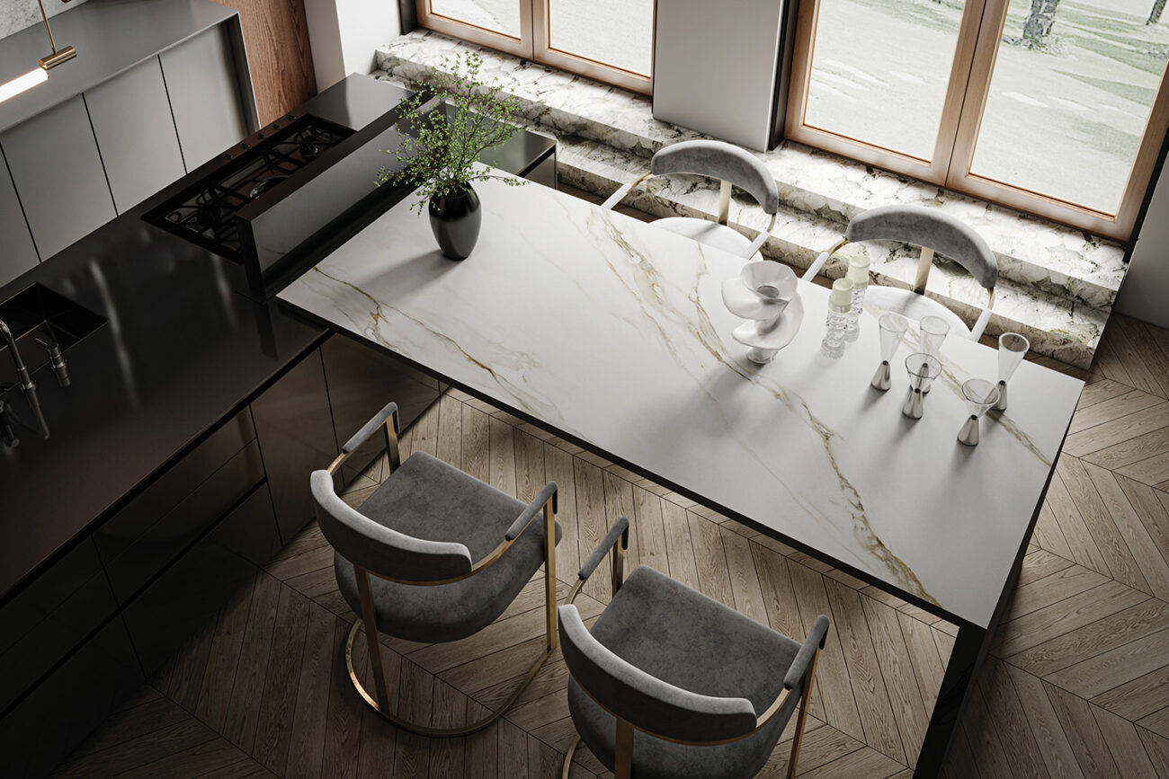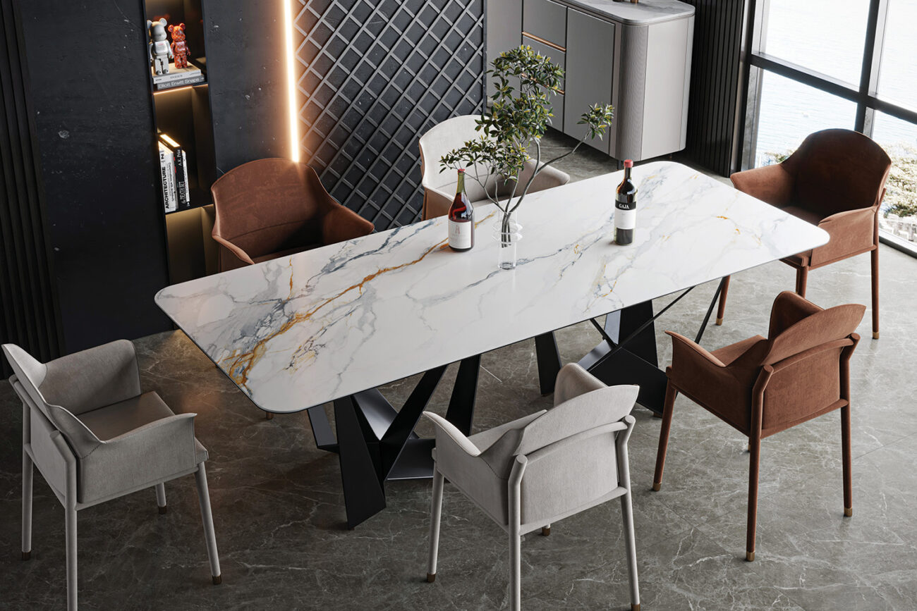 Ein Holzuntergestell gibt dem Tisch einen rustikalen Look, wo hingegen ein Edelstahl-Tischgestell in die Richtung modernes Wohnen führt.